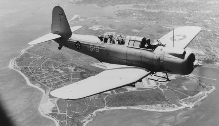 Vought SB2U-3 "Vindicator" of marine Scouting Squadron One, in flight, 7 June 1941