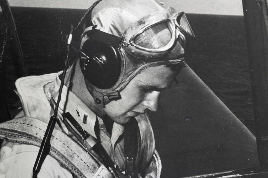 He began his service in the Navy by joining in June 1942 at age 18. He trained and received his Naval Aviator wings and subsequently qualified to land and takeoff from an aircraft carrier in August 1943 at age 19. At that time, he was known as the second youngest pilot in the U.S. Navy. After completing all aspects of flight training he was shipped to the Pacific Theater for aircraft carrier combat operations.