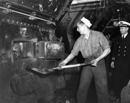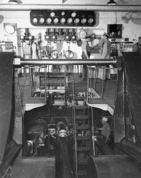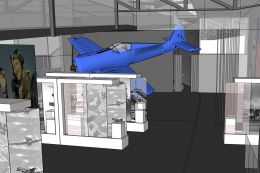 Overhead view of custom-built cases for showcasing and protecting naval service artifacts